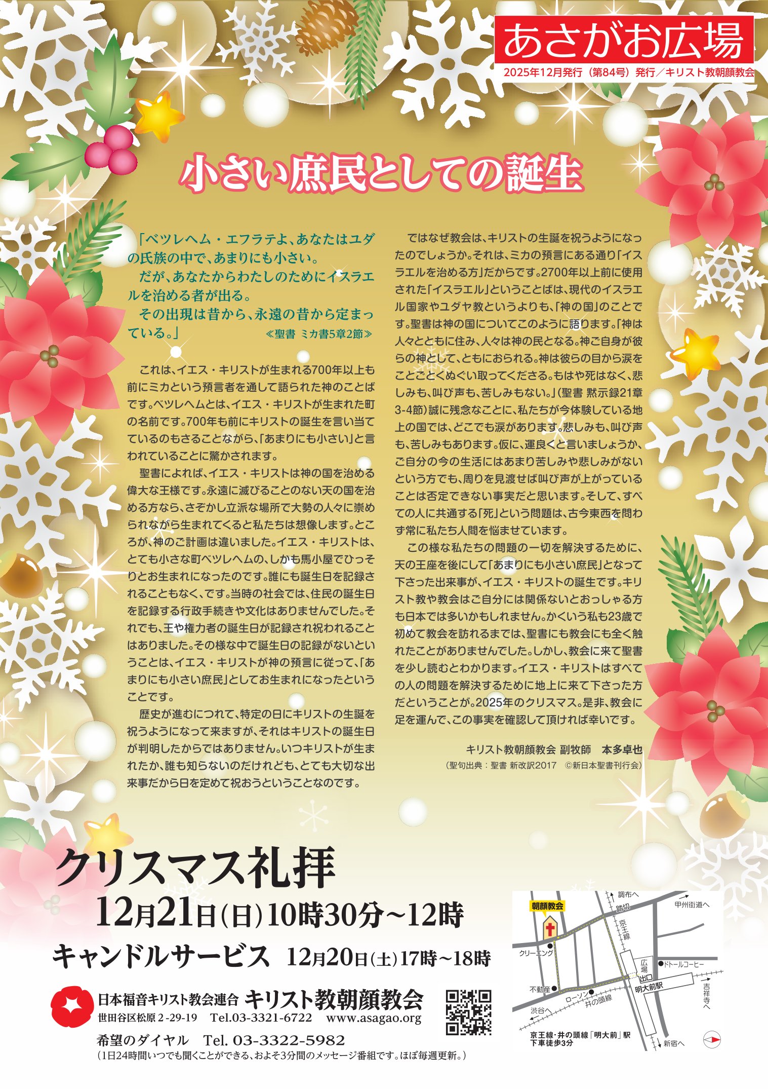 この様な私たちの問題の一切を解決するために、天の王座を後にして「あまりにも小さい庶民」となって下さった出来事が、イエス・キリストの誕生です。キリスト教や教会はご自分には関係ないとおっしゃる方も日本では多いかもしれません。かくいう私も23歳で初めて教会を訪れるまでは、聖書にも教会にも全く触れたことがありませんでした。しかし、教会に来て聖書を少し読むとわかります。イエス・キリストはすべての人の問題を解決するために地上に来て下さった方だということが。2025年のクリスマス。是非、教会に足を運んで、この事実を確認して頂ければ幸いです。